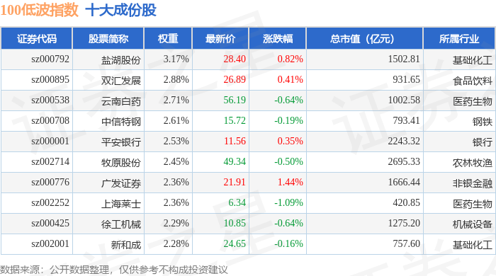 100低波(399645)指数十大成份股详情如下: