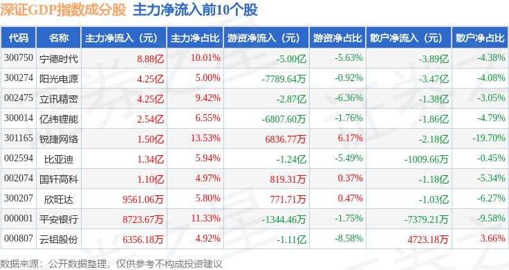 资金流向方面,深证GDP(399648)指数成份股当日主力资金净流出合计13.58亿元,游资资金净流出合计2.57亿元,散户资金净流入合计16.14亿元。成份股资金流向详情见下表:
