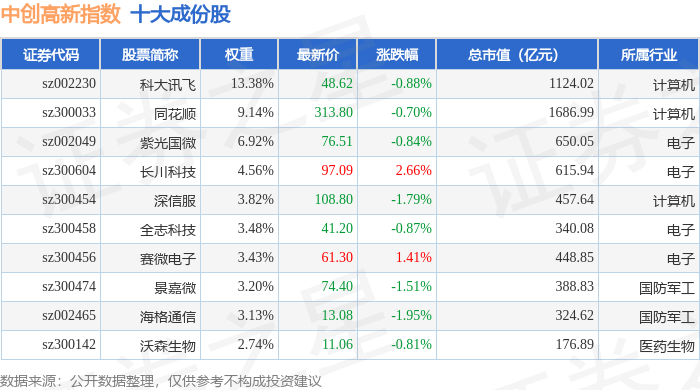 证券之星消息,12月23日,中创高新(399652)指数报收于3578.24点,跌0.72%,成交358.25亿元,换手率3.46%。当日该指数成份股中,上涨的有11家,完美世界以5.68%的涨幅领涨,下跌的有39家,上海瀚讯以10.4%的跌幅领跌。