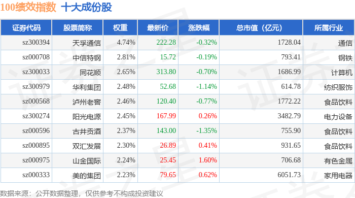 100绩效(399656)指数十大成份股详情如下: