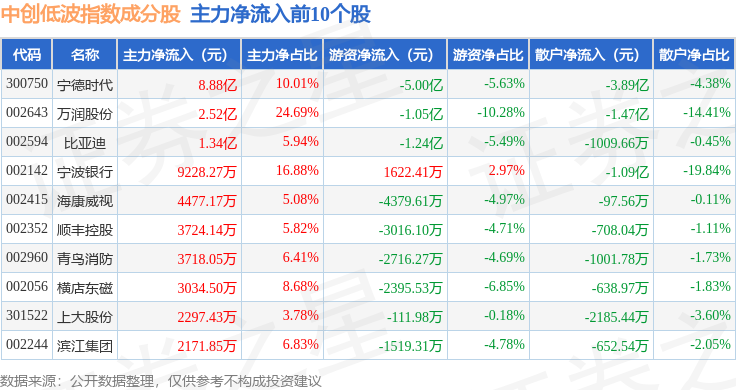 资金流向方面,中创低波(399665)指数成份股当日主力资金净流出合计35.94亿元,游资资金净流出合计3713.91万元,散户资金净流入合计36.31亿元。成份股资金流向详情见下表: