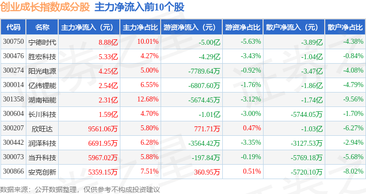 资金流向方面,创业成长(399667)指数成份股当日主力资金净流出合计17.56亿元,游资资金净流入合计6.74亿元,散户资金净流入合计10.83亿元。成份股资金流向详情见下表: