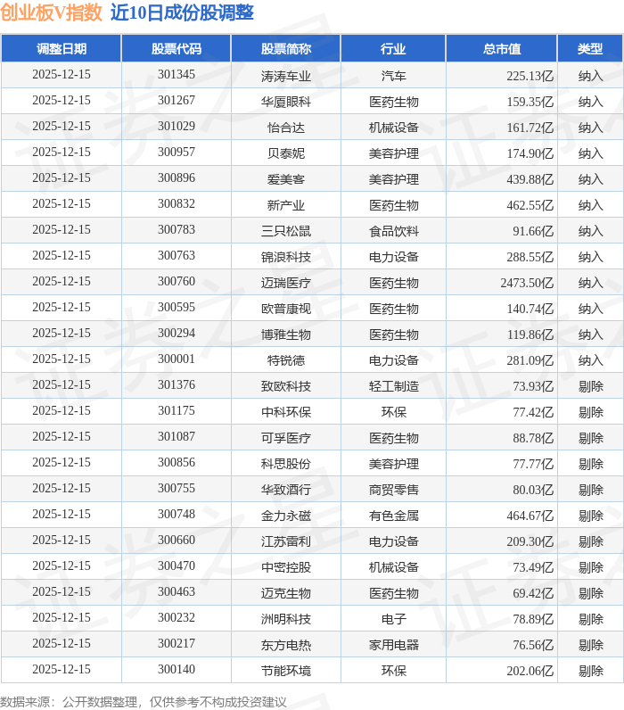近10日内创业板V(399668)指数成份股做了调整,新纳入了12只股票,剔除了12只股票。
