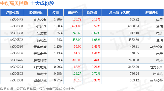 证券之星消息,12月23日,中创高贝(399666)指数报收于2011.49点,涨0.45%,成交2975.96亿元,换手率3.36%。当日该指数成份股中,上涨的有85家,宏达电子以20.0%的涨幅领涨,下跌的有113家,上海瀚讯以10.4%的跌幅领跌。