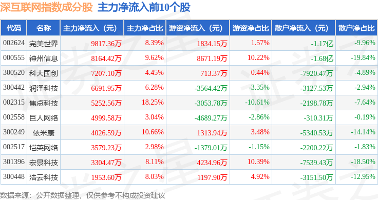 资金流向方面,深互联网(399675)指数成份股当日主力资金净流出合计28.4亿元,游资资金净流入合计7.75亿元,散户资金净流入合计20.64亿元。成份股资金流向详情见下表: