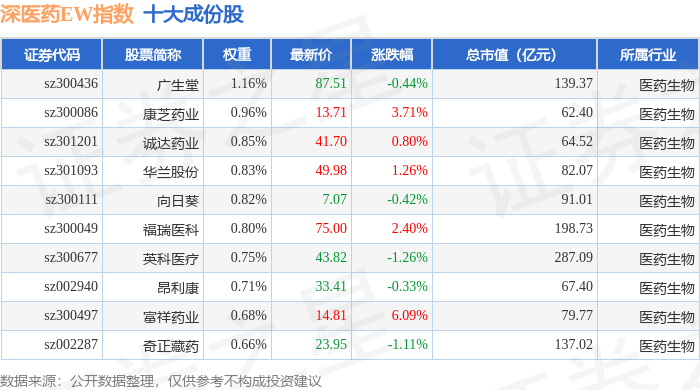 证券之星消息,12月23日,深医药EW(399676)指数报收于3754.12点,跌0.4%,成交423.8亿元,换手率2.22%。当日该指数成份股中,上涨的有48家,宏源药业以15.12%的涨幅领涨,下跌的有169家,佛慈制药以3.85%的跌幅领跌。