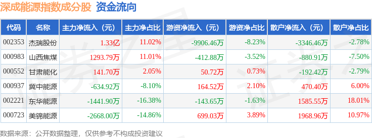 资金流向方面,深成能源(399680)指数成份股当日主力资金净流入合计9943.6万元,游资资金净流出合计9548.72万元,散户资金净流出合计394.88万元。成份股资金流向详情见下表: