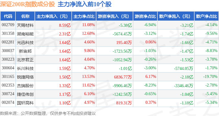 资金流向方面,深证200R(399679)指数成份股当日主力资金净流出合计34.6亿元,游资资金净流出合计9.66亿元,散户资金净流入合计44.26亿元。成份股资金流向详情见下表: