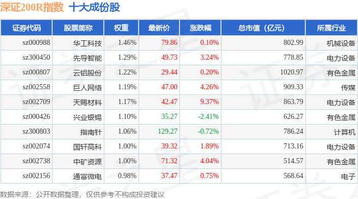 证券之星消息,12月23日,深证200R(399679)指数报收于6214.67点,涨0.31%,成交1594.2亿元,换手率1.73%。当日该指数成份股中,上涨的有83家,天赐材料以9.37%的涨幅领涨,下跌的有114家,航天电器以4.34%的跌幅领跌。