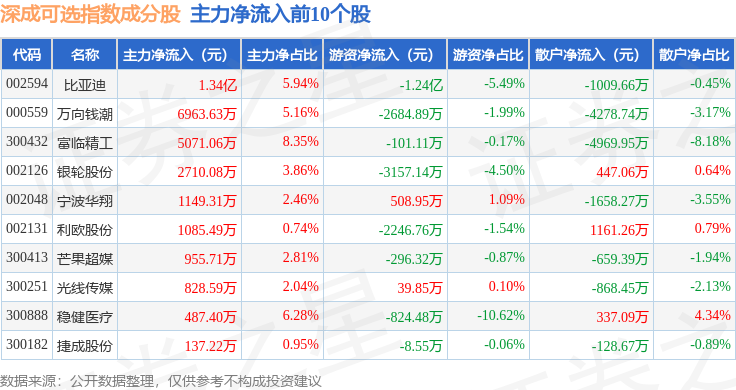 资金流向方面,深成可选(399683)指数成份股当日主力资金净流出合计20.93亿元,游资资金净流入合计3.49亿元,散户资金净流入合计17.44亿元。成份股资金流向详情见下表: