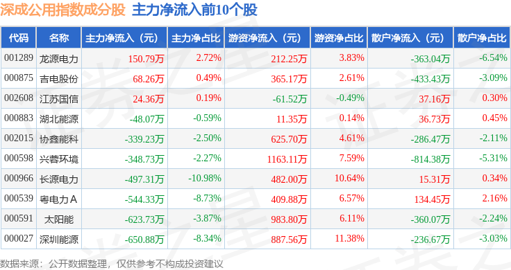 资金流向方面,深成公用(399689)指数成份股当日主力资金净流出合计1.83亿元,游资资金净流入合计9550.51万元,散户资金净流入合计8708.82万元。成份股资金流向详情见下表: