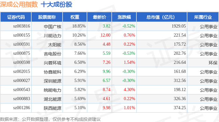 证券之星消息,12月23日,深成公用(399689)指数报收于851.53点,涨0.3%,成交29.91亿元,换手率0.5%。当日该指数成份股中,上涨的有9家,皖能电力以4.3%的涨幅领涨,下跌的有7家,中绿电以1.06%的跌幅领跌。