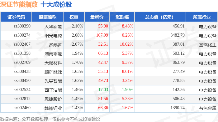 证券之星消息,12月23日,深证节能(399695)指数报收于2881.41点,涨1.33%,成交1215.17亿元,换手率2.03%。当日该指数成份股中,上涨的有64家,铜冠铜箔以12.59%的涨幅领涨,下跌的有35家,节能环境以2.6%的跌幅领跌。