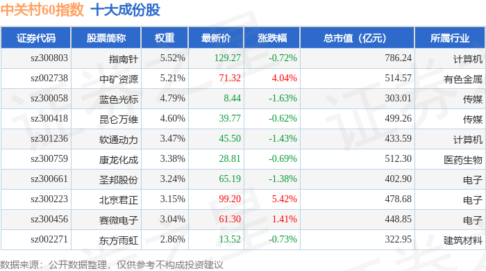 证券之星消息,12月23日,中关村60(399697)指数报收于3575.05点,跌0.62%,成交393.01亿元,换手率2.74%。当日该指数成份股中,上涨的有9家,北京君正以5.42%的涨幅领涨,下跌的有51家,万集科技以5.92%的跌幅领跌。