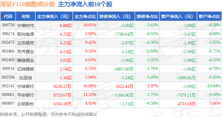 资金流向方面,深证F120(399702)指数成份股当日主力资金净流出合计23.17亿元,游资资金净流出合计7.57亿元,散户资金净流入合计30.74亿元。成份股资金流向详情见下表: