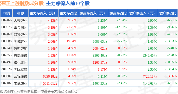 资金流向方面,深证上游(399704)指数成份股当日主力资金净流入合计4.54亿元,游资资金净流出合计8.99亿元,散户资金净流入合计4.45亿元。成份股资金流向详情见下表: