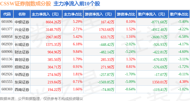 资金流向方面,CSSW证券(399707)指数成份股当日主力资金净流出合计15.35亿元,游资资金净流入合计7.14亿元,散户资金净流入合计8.21亿元。成份股资金流向详情见下表: