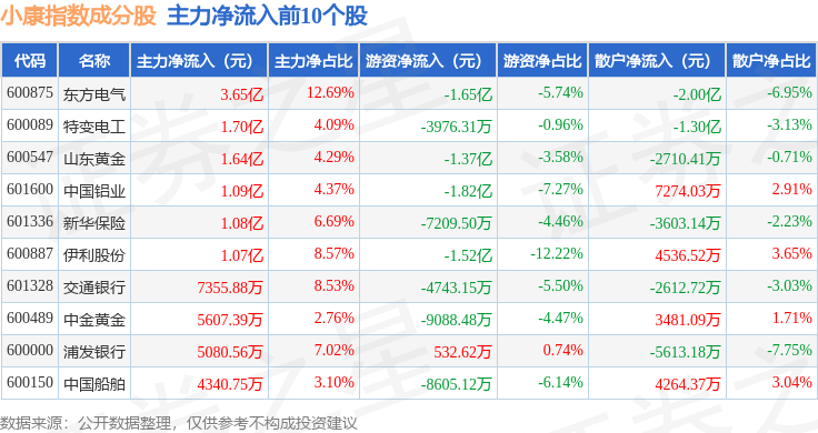 资金流向方面,小康指数(399901)成份股当日主力资金净流出合计39.68亿元,游资资金净流入合计2.74亿元,散户资金净流入合计36.94亿元。成份股资金流向详情见下表: