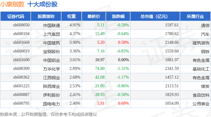 小康指数(399901)十大成份股详情如下: