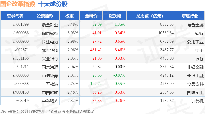 国企改革(399974)指数十大成份股详情如下: