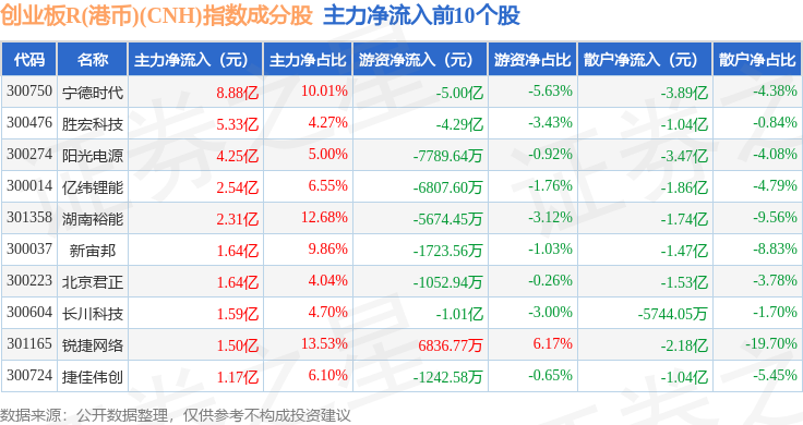 资金流向方面,创业板R(港币)(CNH)(470006)指数成份股当日主力资金净流出合计38.11亿元,游资资金净流入合计11.18亿元,散户资金净流入合计26.93亿元。成份股资金流向详情见下表: