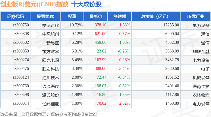 创业板R(美元)(CNH)(470007)指数十大成份股详情如下: