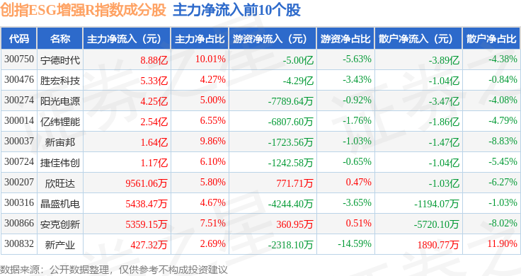 资金流向方面,创指ESG增强R(470034)指数成份股当日主力资金净流出合计15.26亿元,游资资金净流入合计6.72亿元,散户资金净流入合计8.55亿元。成份股资金流向详情见下表: