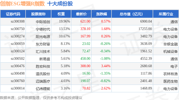 创指ESG增强R(470034)指数十大成份股详情如下: