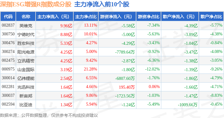 资金流向方面,深指ESG增强R(470032)指数成份股当日主力资金净流出合计49.77亿元,游资资金净流出合计2.8亿元,散户资金净流入合计52.57亿元。成份股资金流向详情见下表: