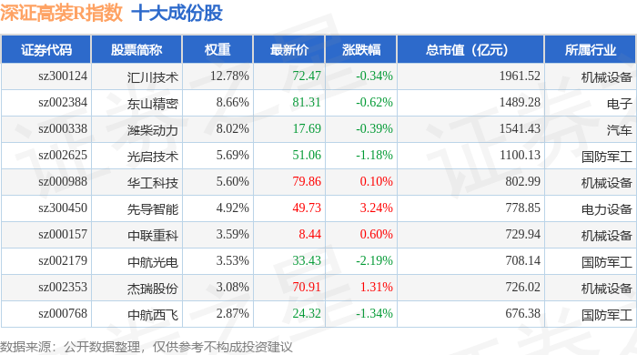 深证高装R(470037)指数十大成份股详情如下: