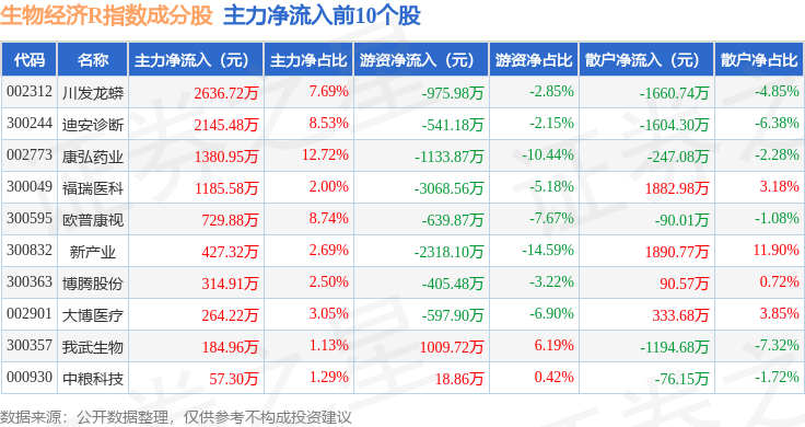资金流向方面,生物经济R(470038)指数成份股当日主力资金净流出合计7.69亿元,游资资金净流入合计1.07亿元,散户资金净流入合计6.62亿元。成份股资金流向详情见下表: