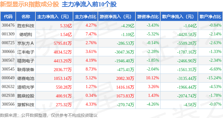 资金流向方面,新型显示R(470048)指数成份股当日主力资金净流出合计16.63亿元,游资资金净流出合计5.08亿元,散户资金净流入合计21.72亿元。成份股资金流向详情见下表: