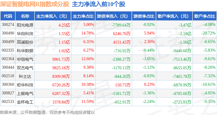 资金流向方面,深证智能电网R(470054)指数成份股当日主力资金净流入合计9.27亿元,游资资金净流入合计5516.04万元,散户资金净流出合计9.82亿元。成份股资金流向详情见下表: