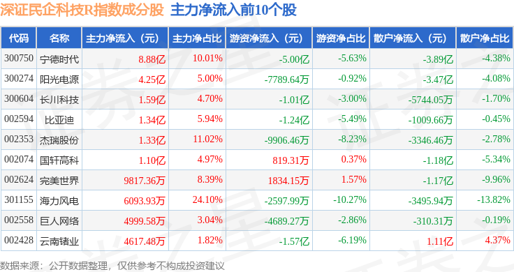 资金流向方面,深证民企科技R(470059)指数成份股当日主力资金净流出合计7.86亿元,游资资金净流出合计10.52亿元,散户资金净流入合计18.38亿元。成份股资金流向详情见下表: