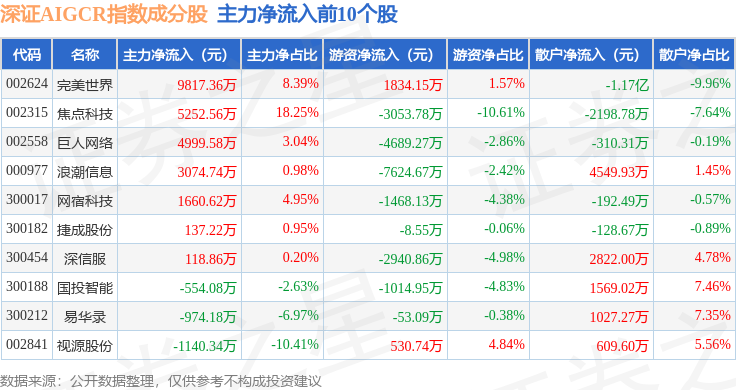 资金流向方面,深证AIGCR(470075)指数成份股当日主力资金净流出合计10.68亿元,游资资金净流入合计7126.33万元,散户资金净流入合计9.97亿元。成份股资金流向详情见下表:
