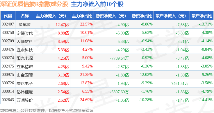资金流向方面,深证优质信披R(470065)指数成份股当日主力资金净流出合计59.68亿元,游资资金净流出合计13.11亿元,散户资金净流入合计72.79亿元。成份股资金流向详情见下表: