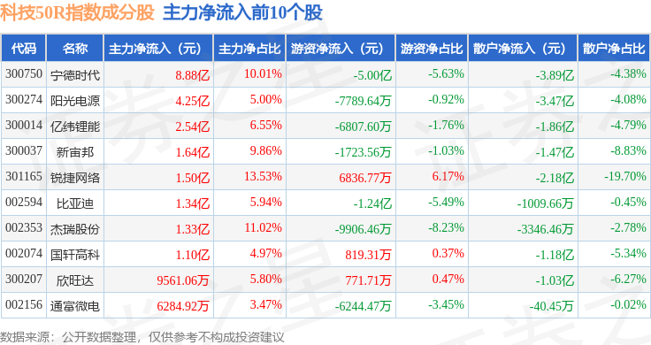 资金流向方面,科技50R(470080)指数成份股当日主力资金净流出合计14.33亿元,游资资金净流入合计7946.81万元,散户资金净流入合计13.53亿元。成份股资金流向详情见下表: