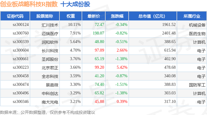 创业板战略科技R(471004)指数十大成份股详情如下:
