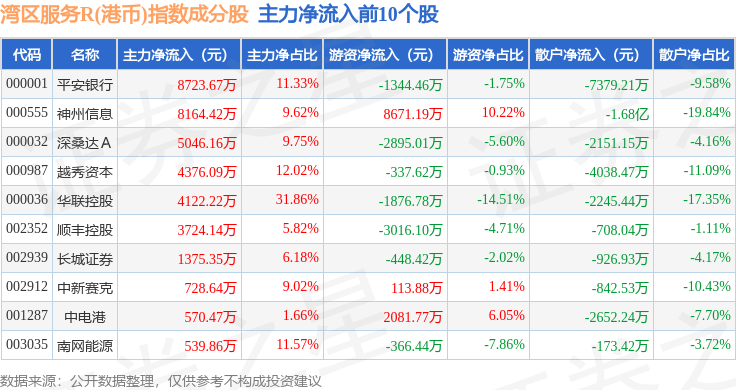资金流向方面,湾区服务R(港币)(480012)指数成份股当日主力资金净流出合计8.03亿元,游资资金净流入合计1.64亿元,散户资金净流入合计6.39亿元。成份股资金流向详情见下表: