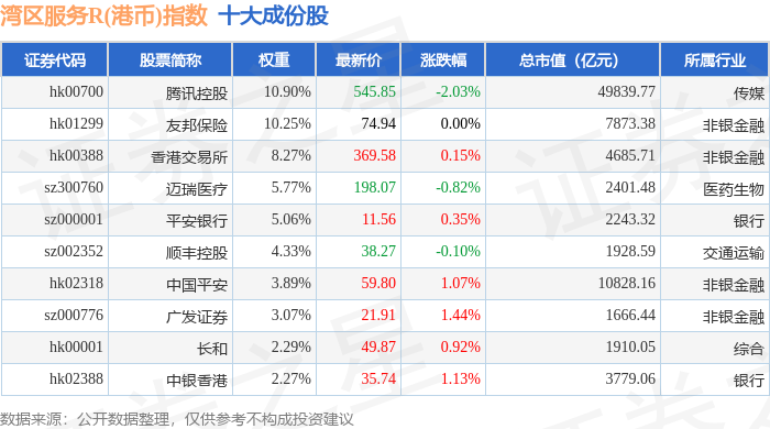 湾区服务R(港币)(480012)指数十大成份股详情如下: