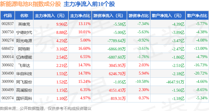 资金流向方面,新能源电池R(480027)指数成份股当日主力资金净流入合计38.48亿元,游资资金净流出合计13.21亿元,散户资金净流出合计25.26亿元。成份股资金流向详情见下表: