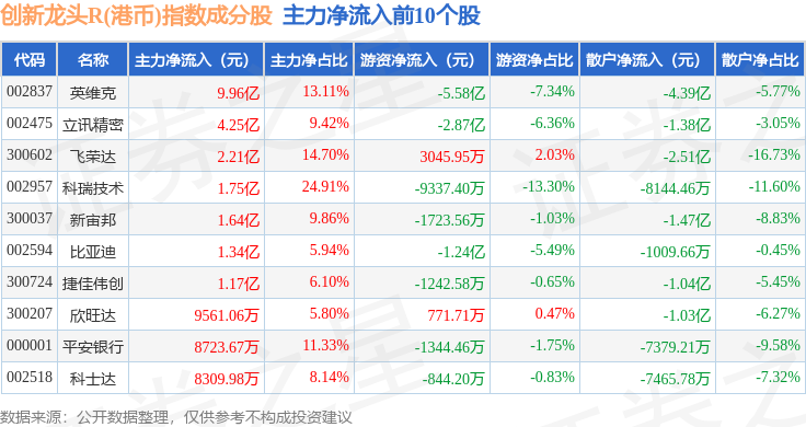 资金流向方面,创新龙头R(港币)(480037)指数成份股当日主力资金净流出合计4.58亿元,游资资金净流出合计6.29亿元,散户资金净流入合计10.86亿元。成份股资金流向详情见下表:
