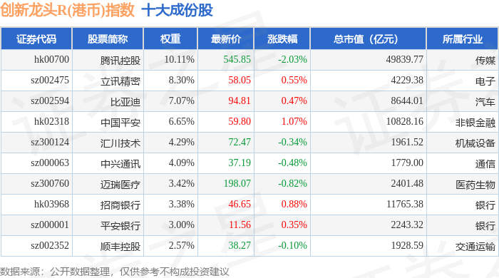 创新龙头R(港币)(480037)指数十大成份股详情如下: