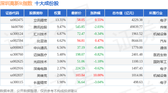 证券之星消息,12月23日,深圳高新R(480038)指数报收于5352.33点,跌0.15%,成交641.89亿元,换手率1.62%。当日该指数成份股中,上涨的有19家,英维克以10.0%的涨幅领涨,下跌的有31家,优必选以3.25%的跌幅领跌。