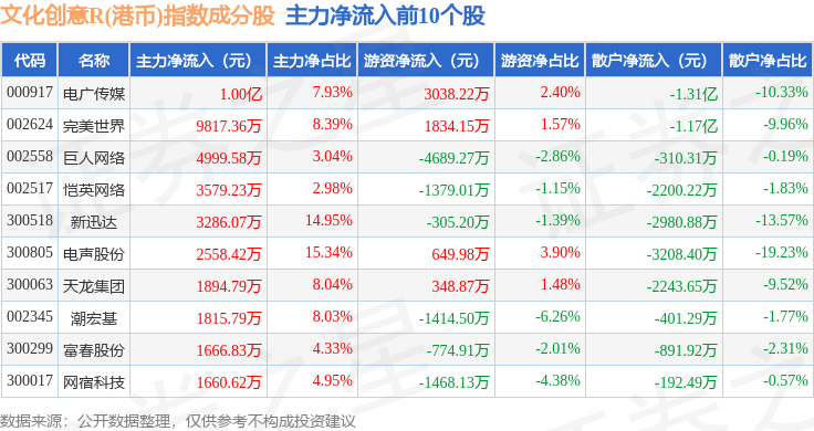 资金流向方面,文化创意R(港币)(480047)指数成份股当日主力资金净流出合计17.31亿元,游资资金净流入合计2.83亿元,散户资金净流入合计14.48亿元。成份股资金流向详情见下表: