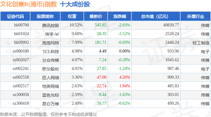 文化创意R(港币)(480047)指数十大成份股详情如下: