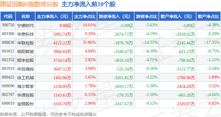 资金流向方面,国证回购R(480063)指数成份股当日主力资金净流出合计2491.3万元,游资资金净流出合计1.15亿元,散户资金净流入合计1.36亿元。成份股资金流向详情见下表: