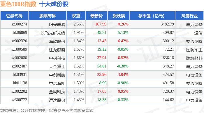 证券之星消息,12月23日,蓝色100R(480068)指数报收于4606.91点,跌0.54%,成交492.23亿元,换手率1.09%。当日该指数成份股中,上涨的有31家,胜通能源以10.02%的涨幅领涨,下跌的有63家,海昌海洋公园以7.29%的跌幅领跌。