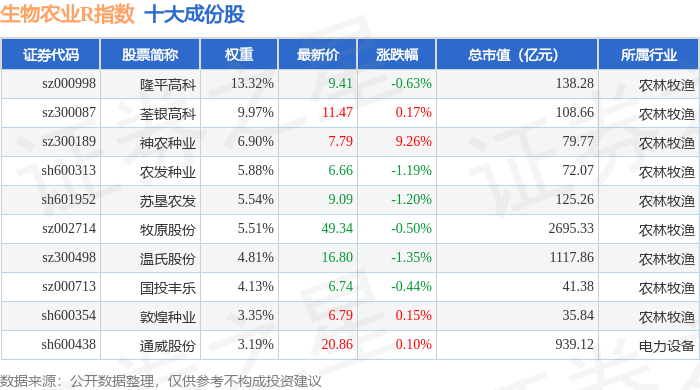 生物农业R(480072)指数十大成份股详情如下: