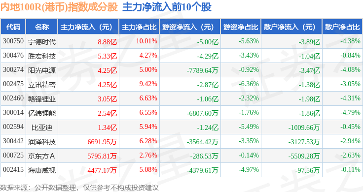 资金流向方面,内地100R(港币)(483002)指数成份股当日主力资金净流出合计1.88亿元,游资资金净流出合计5.41亿元,散户资金净流入合计7.29亿元。成份股资金流向详情见下表: